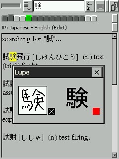 The lupe comes with a scribble pad, a small screen area for writing practice. This feature is only available when looking at a single character. To open the scribble pad, tap to the left or right of the character shown in the lupe, depending on whether you're left- or right-handed. (Left-handers will know right away why this is important ;-) To clear the pad, press the black X button, to close it, press and hold the button.